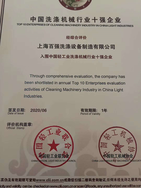 本次會議還經(jīng)行了十強(qiáng)企業(yè)授牌儀式,上海百強(qiáng)洗滌設(shè)備制造有限公司再度入圍中國輕工業(yè)洗滌機(jī)械行業(yè)十強(qiáng)企業(yè)!